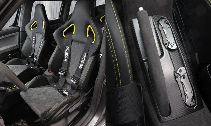 Koncept překvapí svým interiérem upraveným do rallyové podoby. Základem jsou čtyři upravená samostatná sedadla Recaro se čtyřbodovými pásy, sportovní volant a speciální páčky pro řazení. Interiér zdobí karbonové prvky v kombinací s luxusní alcantarou. Příjemným detailem jsou i hliníkové pedály a speciální prahové lišty. K nadstandardní výbavě patří i nože pro řezání bezpečnostních pásů, integrovaná lékárnička do palubní desky před spolujezdce, držák tabletu či lopatky ve dveřích.