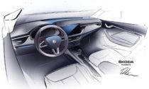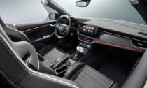 „Sportovní akcenty v interiéru vytvářejí čtyřbodové bezpečnostní pásy a speciální závodní sedadla značky Sparco, jejichž sedáky a opěradla jsou potažené černou perforovanou kůží. Bočnice sedadel jsou potažené černou karbonovou kůží s bílými kontrastními švy. Výrazné švy vytvářejí akcenty také na dalších dílech v interiéru z černé kůže, například na středové loketní opěrce, manžetě řadicí páky, na madle páky ruční brzdy nebo na dělicí stěně za sedadly. Tuto kombinaci nalezneme i na dolních dvou třetinách věnce volantu. Horní třetina volantu je stejně jako hlavice řadicí páky potažená bílou kůží. Pozornost upoutá zejména kožená dělicí stěna v černé barvě za sedadly, ve které jsou zabudovány dva basové reproduktory, které drží dva vyšití lvi. Subwoofer má výkon 2 250 W, ostatní reproduktory pak 320 W. Do zavazadlového prostoru vozu Slavia se vejdou dva elektrické skútry značky Škoda. Tyto sklápěcí elektrické skútry jsou perfektním a ekologickým řešením pro takzvaný poslední kilometr do cíle cesty,“ dodávají k interiéru.
