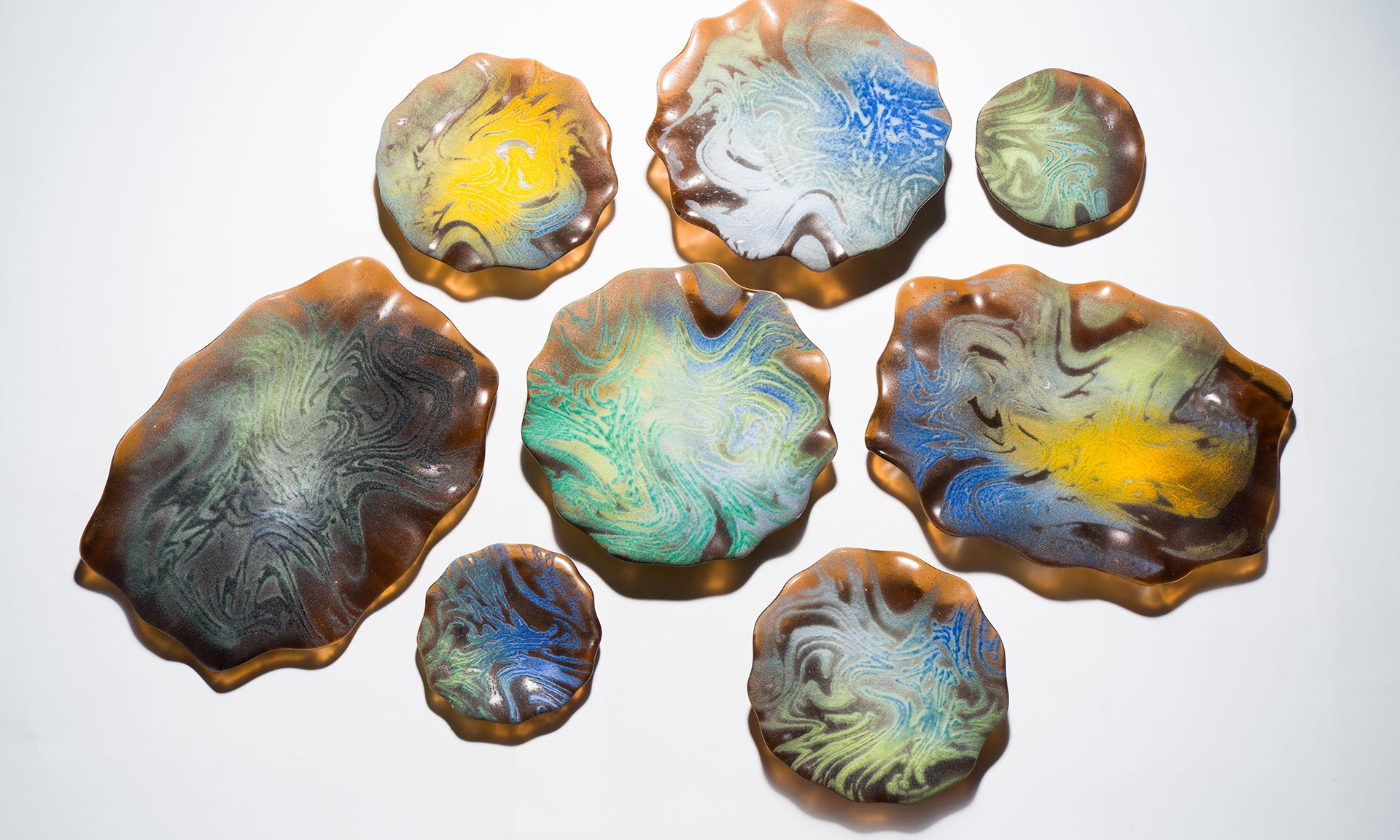 „Místo formální dokonalosti se sklo poddává gravitaci, jeho formy organicky rostou, nese stopy nástroje či destrukce, zachycuje geologické procesy a zpomaluje je v čase, rozmazává hranice mezi funkčním designem, uměleckým objektem a prostorem, propojuje se s tělem v křehké symbióze, ale i v subverzivních příbězích. Sklo je zde tématem, ale také médiem – tématem pro uvažování o jeho materiální podstatě, historii, původu, technologických postupech i zaniklých sklárnách… médiem pro osobní výpovědi, provokativní výkřiky i ticho,“ dodává.