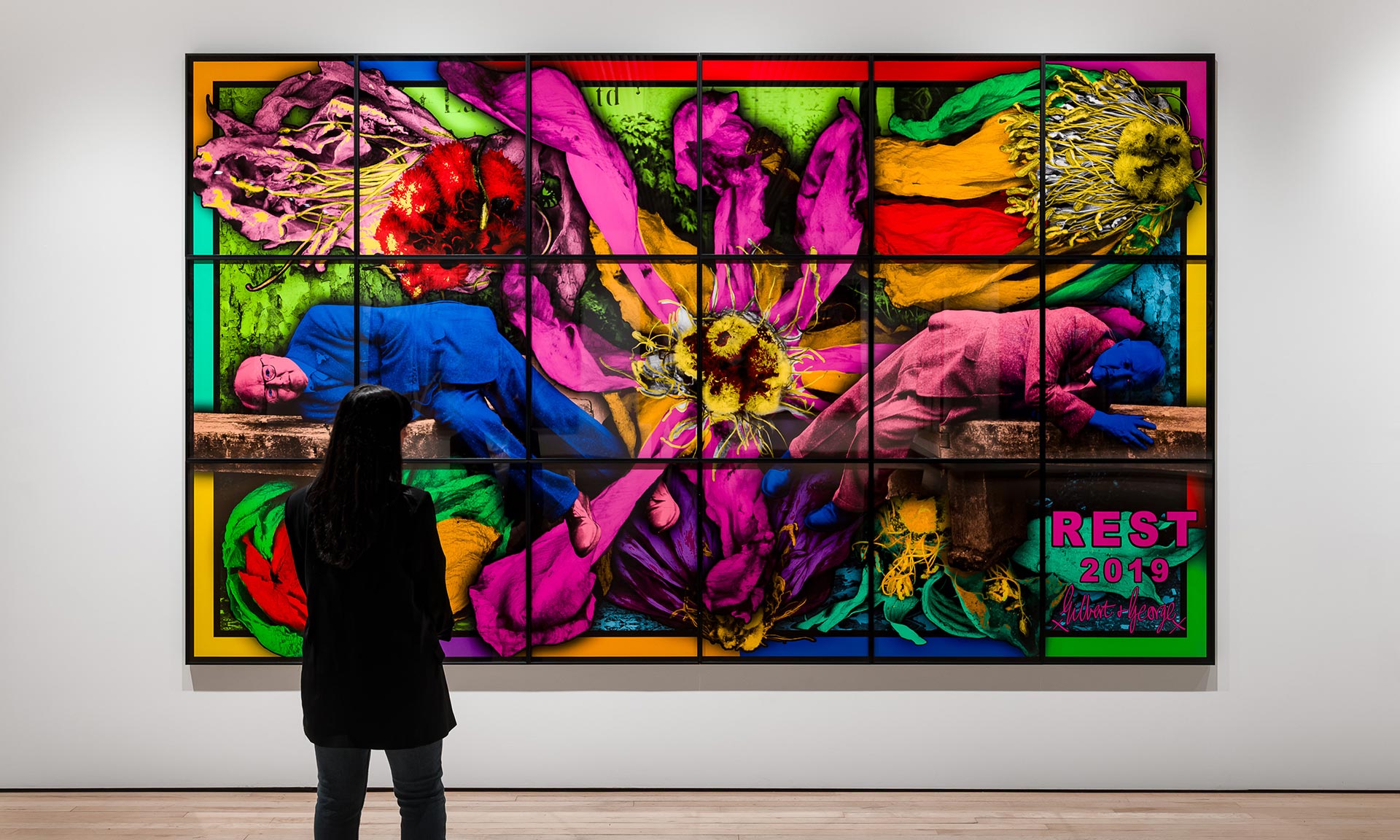 „ Prezentace zdůrazňuje vývoj Gilberta & George za posledních 25 let a zkoumá, jak technologie učinila jejich reflexe dnešní společnosti větší a odvážnější než kdykoli předtím. Umělci proměňují prostor více než 60 instalacemi od podlahy ke stropu a představují nové obrazy vedle svých uznávaných děl v nadživotní cestě moderním světem, jak jej vidí oni. Gilbert & George jsou ikonickými umělci, kteří se vyznačují monumentálním odhodláním být „živými sochami“ již posledních pět desetiletí. Inspirováni moderním světem působí jako vizuální archeologové naší doby a zachycují prvky naší měnící se společnosti,“ uvádí kurátoři výstavy,