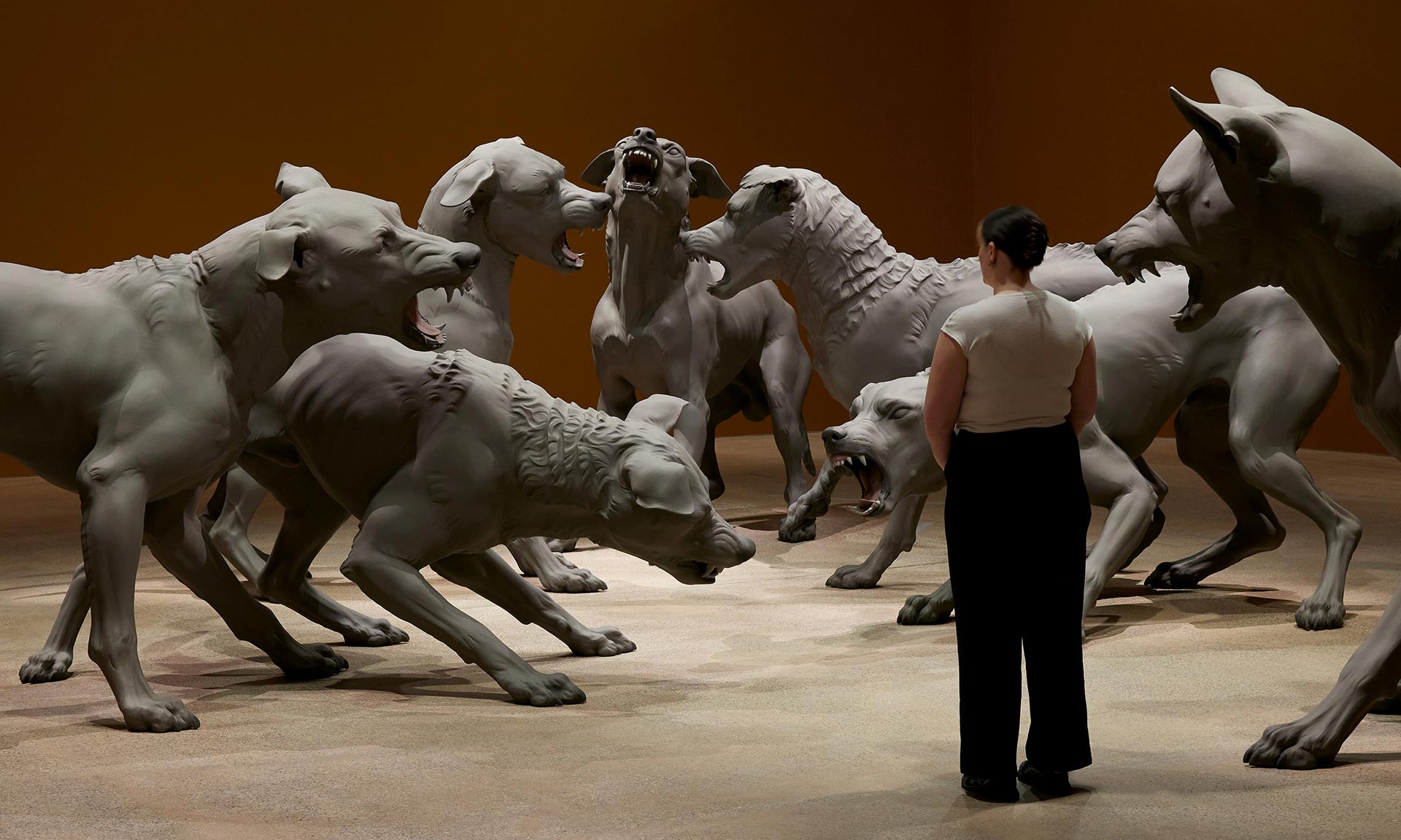 „Ústředním bodem výstavy je Havoc, nové pohlcující dílo představující skupinu bojujících psů v nadživotní velikosti, vytvořené speciálně pro tuto příležitost. Havoc, naddimenzované, ale nabité tichou, znepokojivou intenzitou, zve diváky do prostoru, který je zároveň intimní i zlověstný,“ dodávají k novému a nejtemnějšímu vílu v expozici.