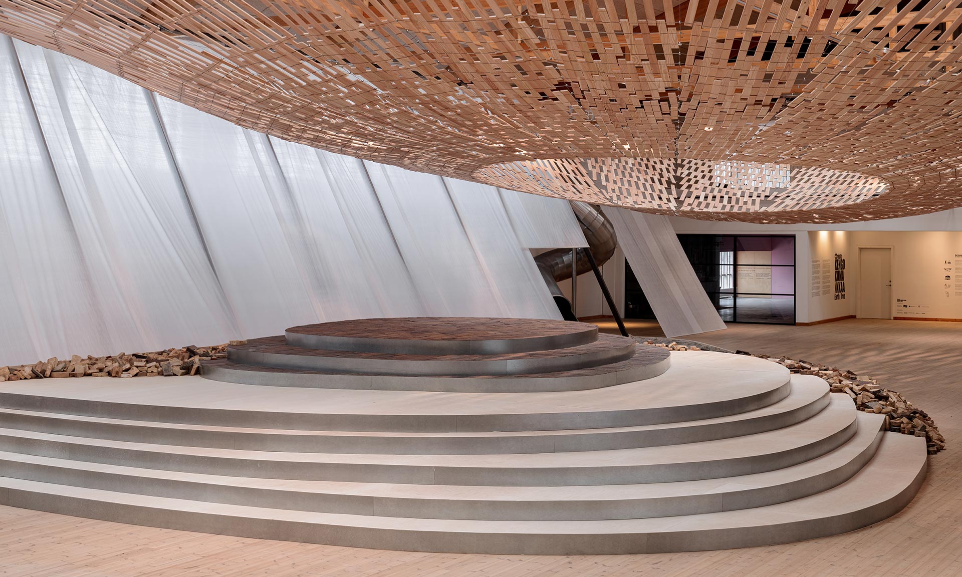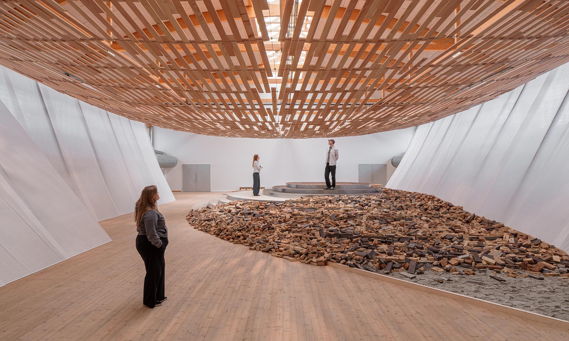 „Výzkumy ukazují, že pouhé pobývání v lese snižuje hladinu stresových hormonů, zpomaluje srdeční tep a zmírňuje úzkost, depresi a únavu. Právě tento pocit proměnil architekt Kengo Kuma ve fyzický prostor v CCreate. V instalaci Earth Tree byly dřevo a cihla vybrány pro jejich hmatové a historické rozměry. Dřevo vnáší do prostoru vůni lesa. Cihla zakotvuje instalaci v tisícileté stavební tradici. Oba materiály jsou kulturně zakořeněny v japonském i severském přístupu k přírodě – a právě setkání těchto dvou tradic Yuki Ikeguchi, který vedl práci KKAA na této instalaci, přetvořil v jednotný výraz,“ uvádí kurátoři výstavy.