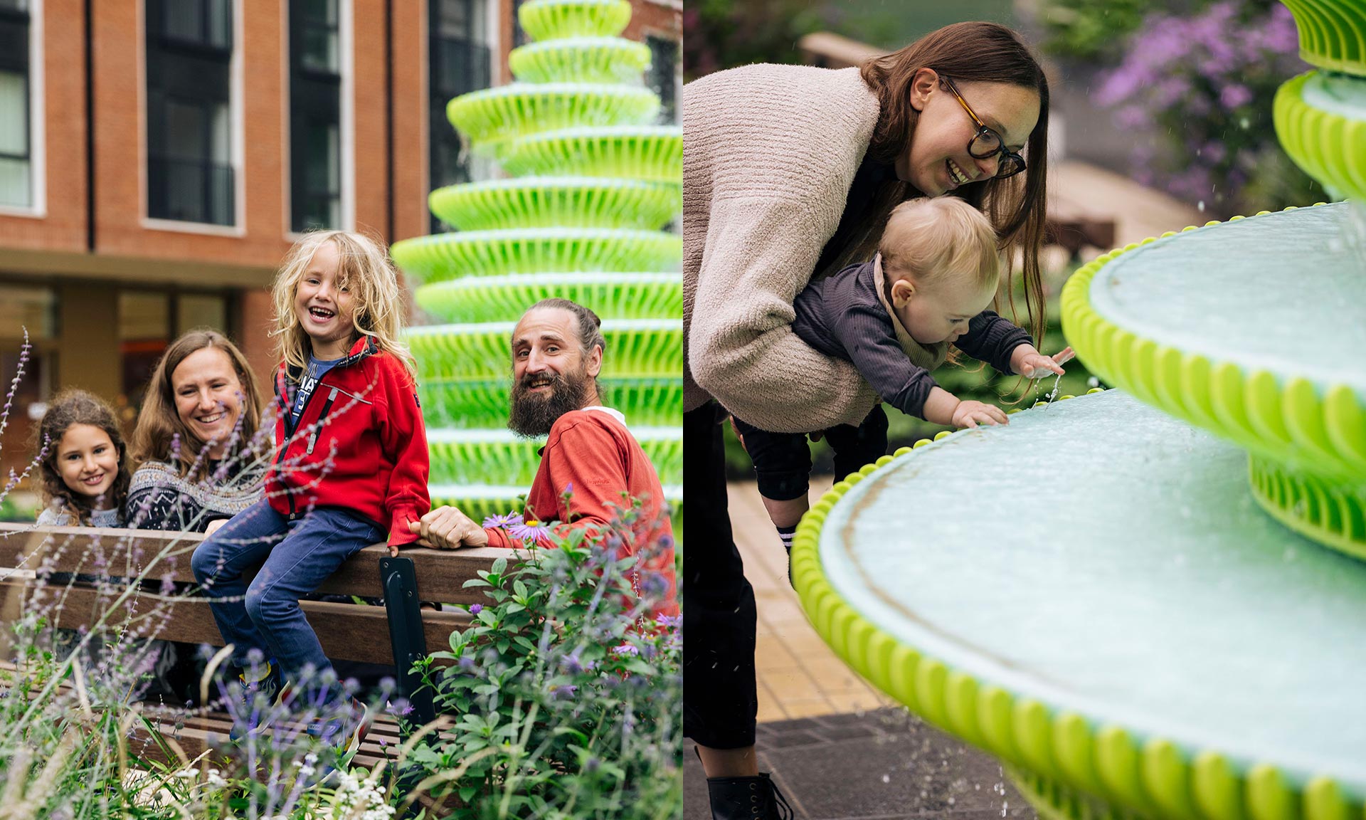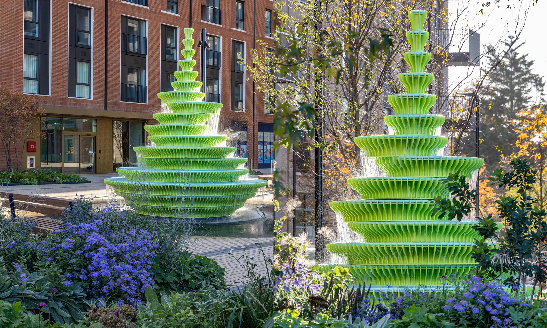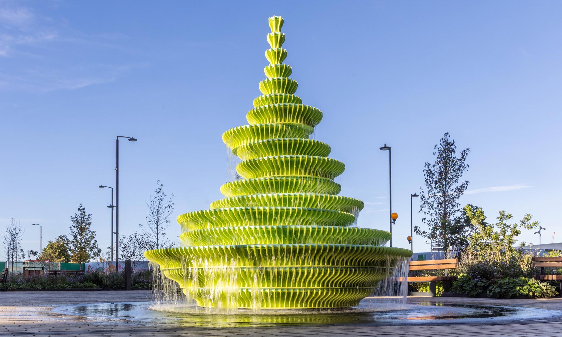 Britské architektonické a designérské studio Neon vytvořilo pro londýnskou čtvrť The Fountain. Do obytné čtvrti Brent Cross Town vytvořili zářivou žlutozelenou strukturu, která je tvořena 17 vrstvami vždy mírně posunutých základen. Výsledný dojem z moderní interpretace klasické fontány je svěží, moderní, trochu kontroverzní a jistě i nadčasový. Speciální je i materiál. Celková výška fontány je 430 centimetrů.