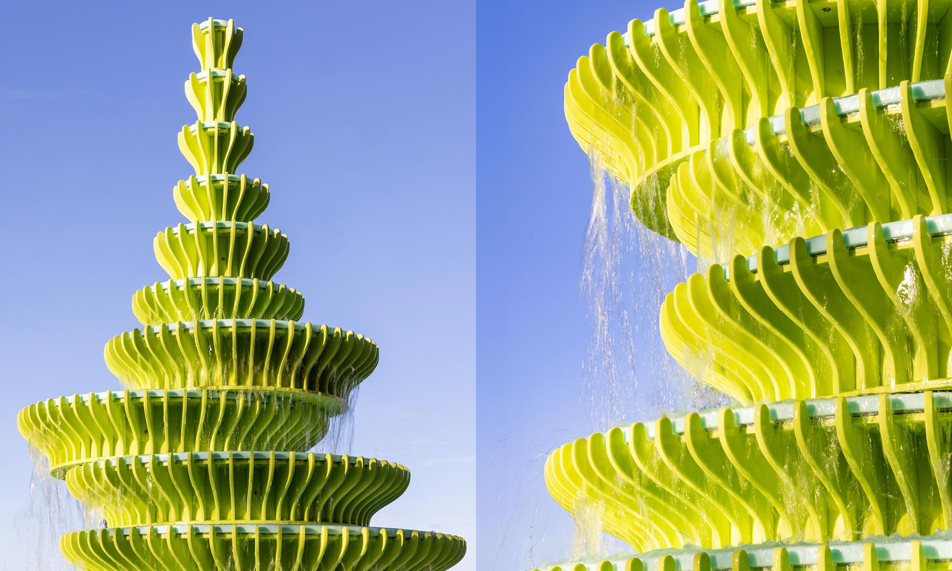 „Výběr materiálů se řídí kritérii výkonu, nákladů a životnosti. Materiál Hi-Macs byl vybrán pro svou odolnost při použití ve vrstvených deskách, barevnou stálost a přesné provedení kaskádového designu. Tým používá Hi-Macs v určené paletě barev, jasně zelenou pro svislé prvky a tyrkysovou pro vodní stoly, aby si materiál zachoval svou živost a přesnost po mnoho let,“ dodávají k tomu, proč pro fontánu vybrali umělý kámen.