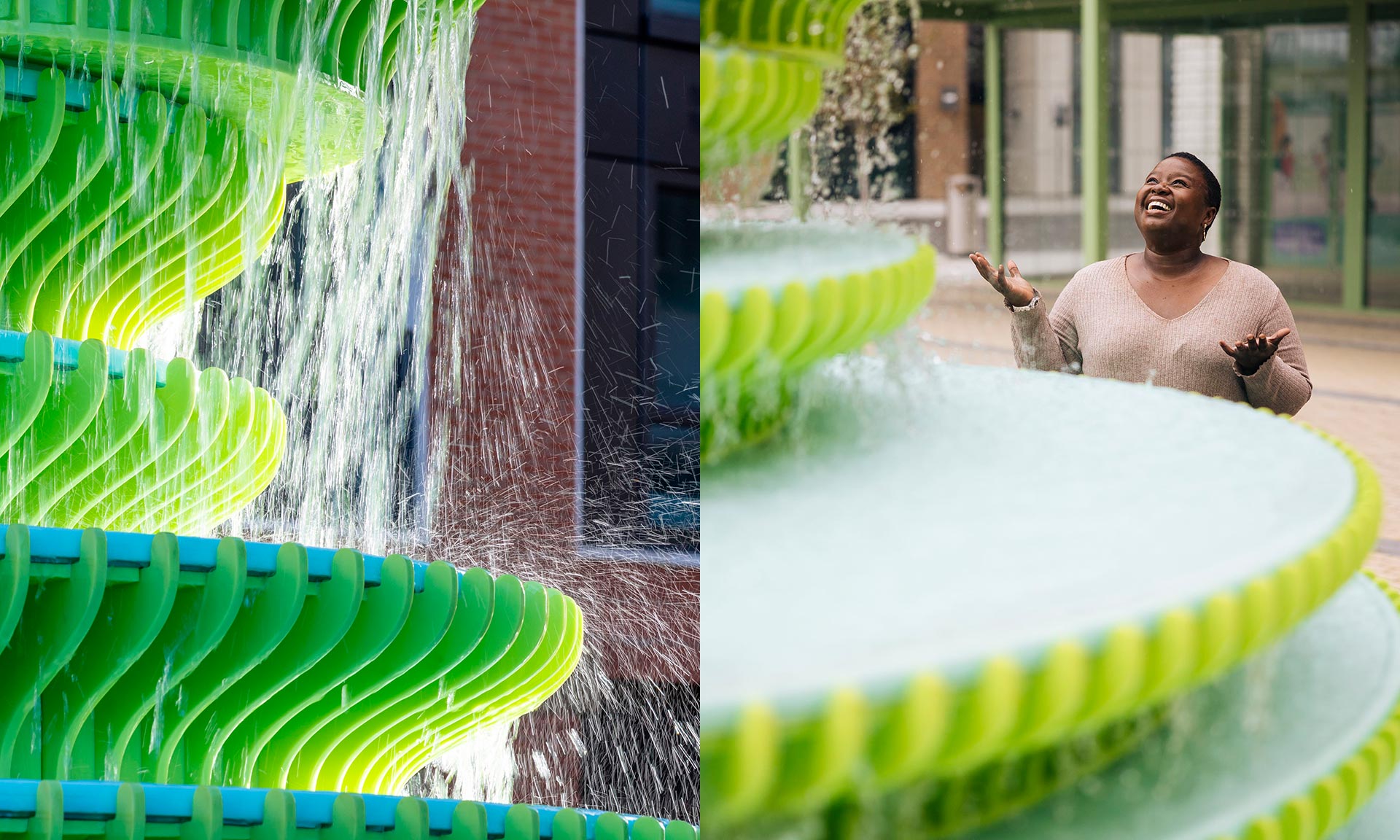 „Fontána přetváří klasickou stupňovitou fontánu v moderní dominantu náměstí Neighbourhood Square v Brent Cross Town. Jemně promíchané vrstvy vytvářejí měnící se vodní kaskády, odrazy a zvuky, které se mění s pohybem, počasím a světlem. Umělecké dílo, navržené jako místo setkávání, odpočinku a navazování kontaktů, přináší společenského ducha evropských náměstí do nového městského prostředí,“