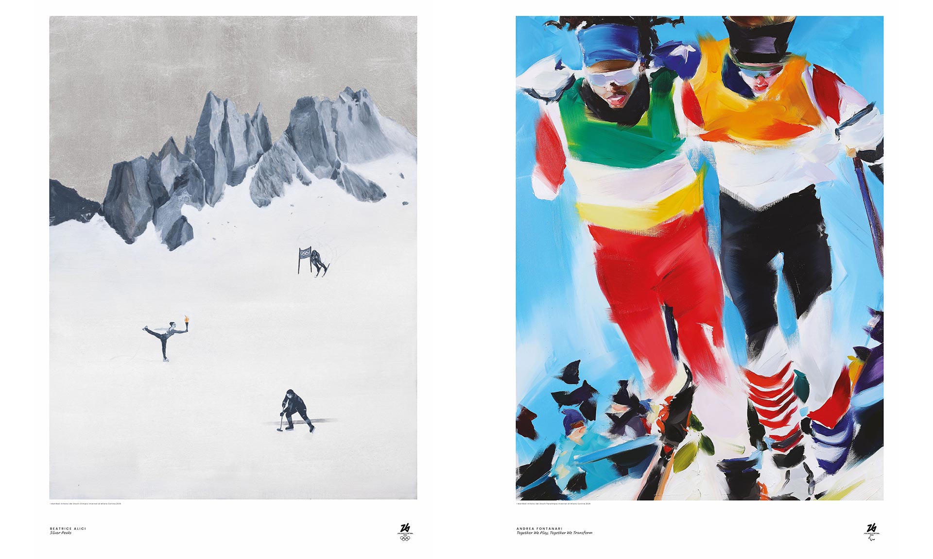„Za přítomnosti umělců a partnerských institucí byly v Triennale Milano představeny umělecké plakáty pro hry Milano Cortina 2026. Plakáty vytvořilo deset italských umělců mladších 40 let a nabízejí kreativní interpretaci her. Výsledkem je sbírka uměleckých děl, která odráží živost současné italské umělecké scény a dynamického, energického ducha nadcházejících olympijských a paralympijských zimních her. Pět olympijských uměleckých plakátů navrhli Beatrice Alici, Martina Cassatella, Giorgia Garzilli, Maddalena Tesser a Flaminia Veronesi. Pět paralympijských uměleckých plakátů vytvořili Roberto de Pinto, Andrea Fontanari, Aronne Pleuteri, Clara Woods a Giulia Mangoni,“ uvádí k plakátům organizátoři olympiády.